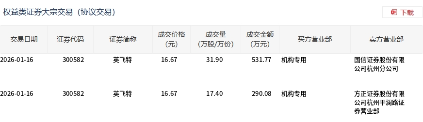 1月16日,英飞特大宗交易成交49.3万股,成交额821.85万元,占当日总成交额的1.21%,成交价16.67元,较市场收盘价19.29元折价13.58%。