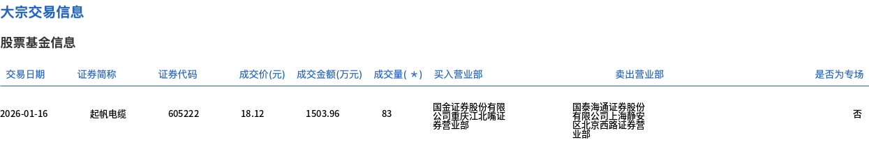 1月16日,起帆电缆大宗交易成交83万股,成交额1503.96万元,占当日总成交额的6.77%,成交价18.12元,较市场收盘价20.07元折价9.72%。