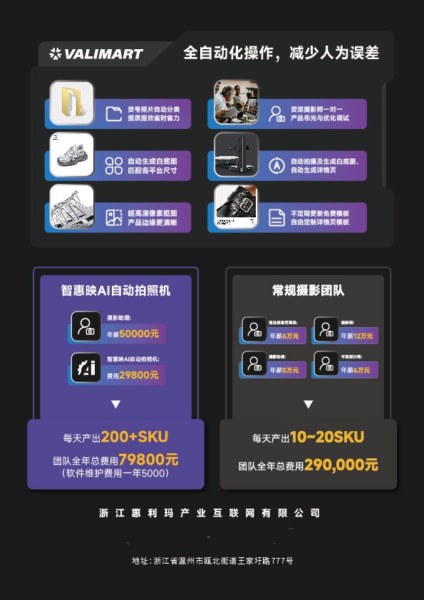 对鞋服企业尤其是中小商家来说,AI拍照智能体的核心吸引力在于效率与成本的双重优化。数据显示,一个常规商品拍摄团队(含摄影师、修图师等)年均人力成本约29万元,日处理SKU仅10-20个;而一台“智惠映”售价2.98万元,年度总投入(含软件维护)约7.98万元,日均可处理200个以上SKU,能节省74%工时,内容产出效率提升7-8倍,还直接替代了多岗位协作的传统链条。