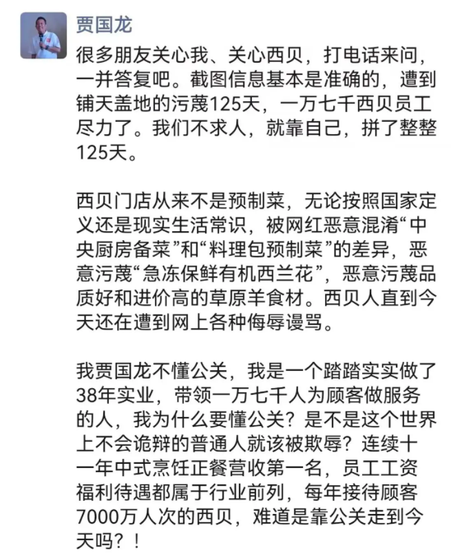 更为讽刺的是,贾老板还在朋友圈中喊冤道:“我为什么要懂公关?难道西贝是靠公关走到今天?”这句话的潜台词是:我是干实事的人,不屑玩虚的。