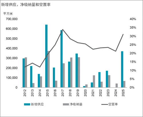 截至2025年四季度,受优质项目大面积供应影响,全市甲级写字楼年度净吸纳量约6.67万平方米,同比增长61%;空置率同步上升至31.07%;租金方面,全市甲级写字楼平均租金环比下降2%,至每月每平方米人民币81.99元。