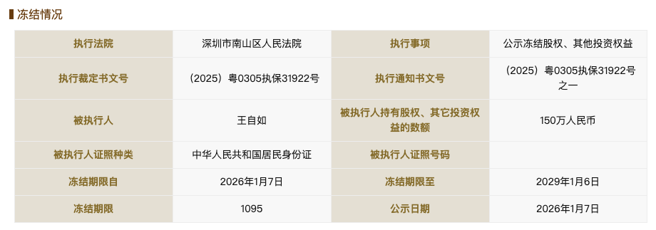 国家企业信用信息公示系统网站显示,1月7日,王自如新增一则股权冻结信息,股权所在企业为深圳市悦宸汽车美容有限公司,冻结股权数额150万人民币,冻结期限3年,执行法院为广东省深圳市南山区人民法院。值得一提的是,2024年2月,王自如持有该公司的150万股权已被冻结。