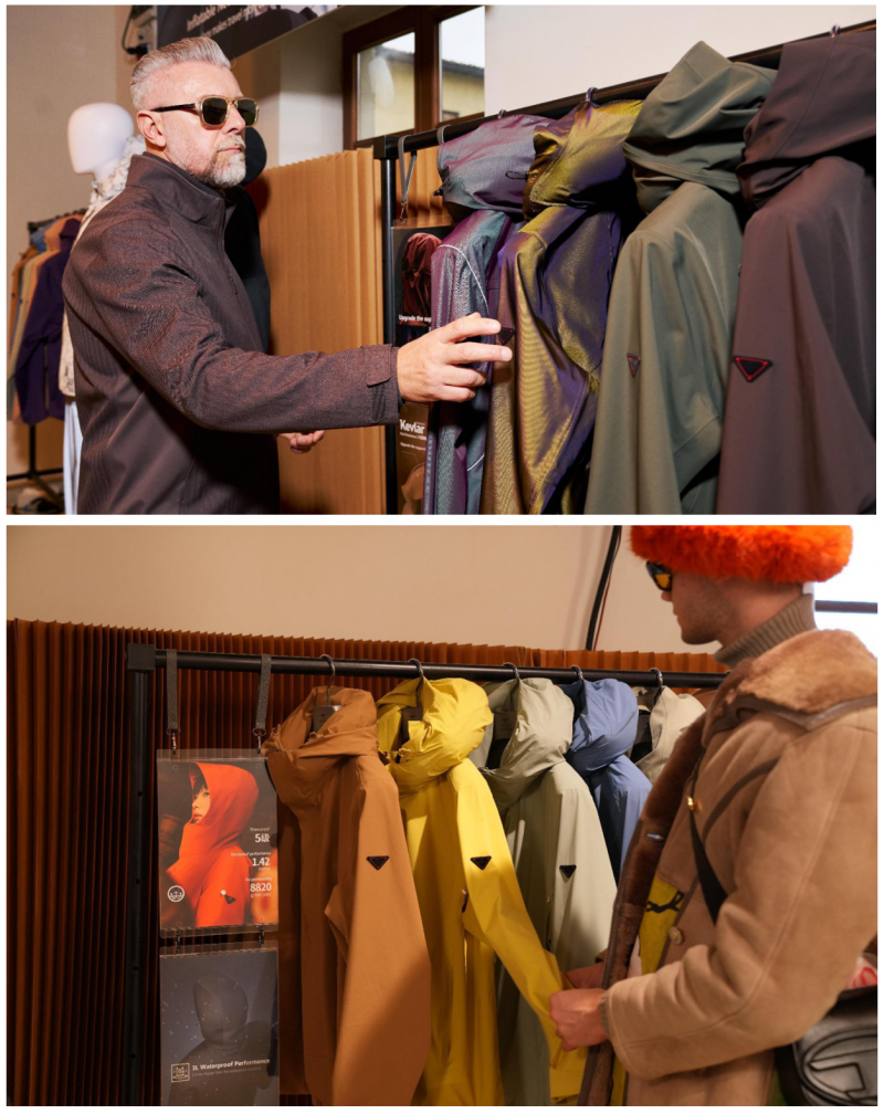 本次展会七匹狼带来的商旅科技夹克系列中,你很难看到喧宾夺主的装饰,品牌将功夫深植于“看不见”的地方。产品选用了高品质功能面料,远观是细腻的哑光质感,沉稳内敛,近触却异常柔软亲肤,活动时毫无拘束感。