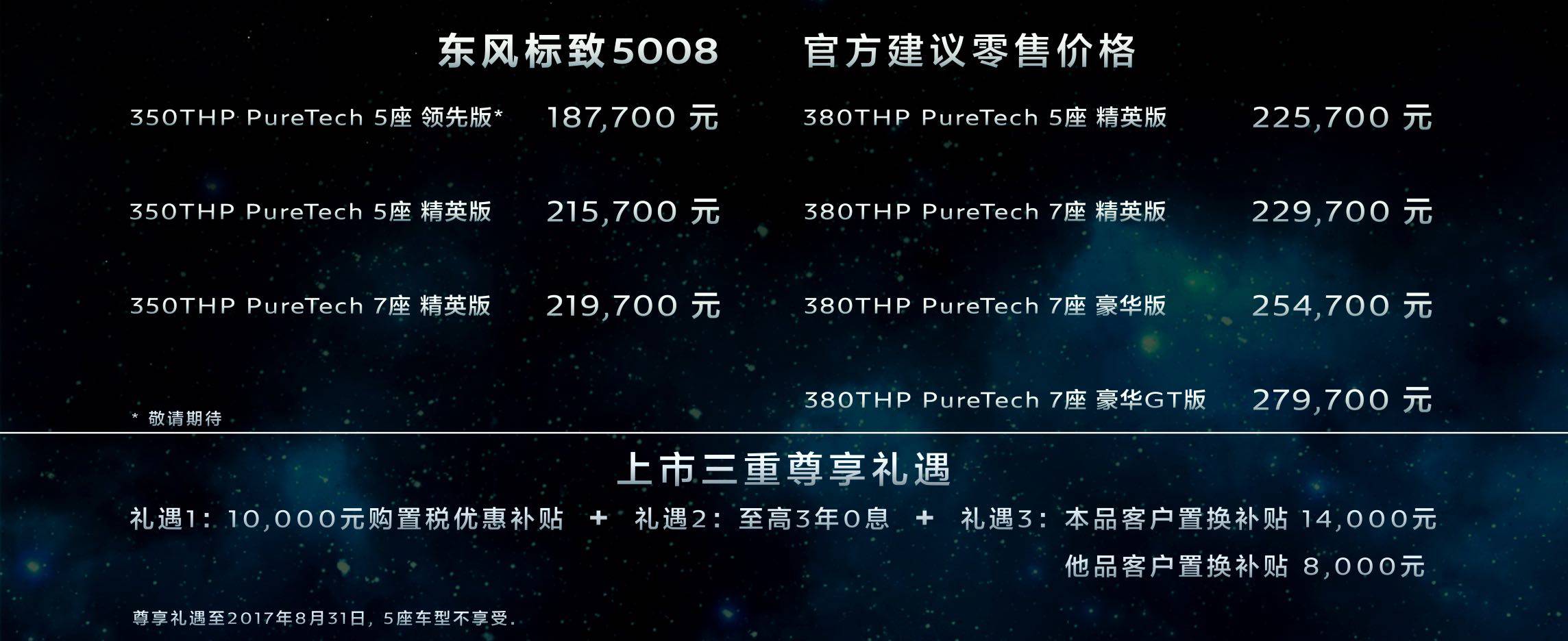 就色彩而言,东风标致为5008推出了冰川蓝、珠光白、碳晶黑3种颜色,动力上则提供了350THP(1.6T)和380THP(1.8T)两种动力。配置方面,七款车型供消费者选择。