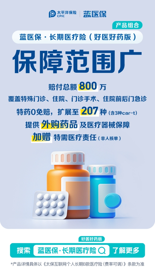 外购药械覆盖广度:“蓝医保·长期医疗险(好医好药Pro版)”和“蓝医保·中高端医疗险(特需直付)”均实现了“不限疾病全面放开外购药品和器械”的责任,不限清单(好医好药Pro版以2024年底前批准为准),0免赔额(中高端版需满足主险免赔额后),100%报销。且“好医好药Pro版”将此责任保证续保20年,这在保障全面性上是一个显著优势。