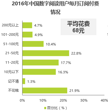 根据艾媒咨询《2016年中国数字阅读行业报告》,数字阅读用户的月度订阅付费情况如下: