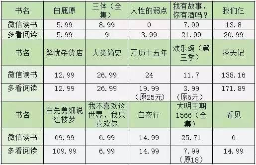 表3.2 附表:微信读书与多看阅读书籍价格对比