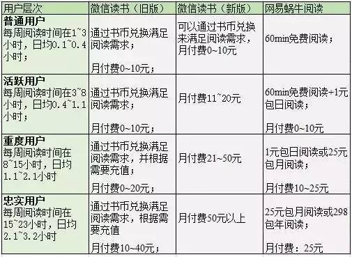 对于网易蜗牛阅读,其每日赠送60min免费阅读时长,1元1天(自然天)的付费模式,却能够对微信读书造成一定的竞争力。我们参考上文对用户做的分级: