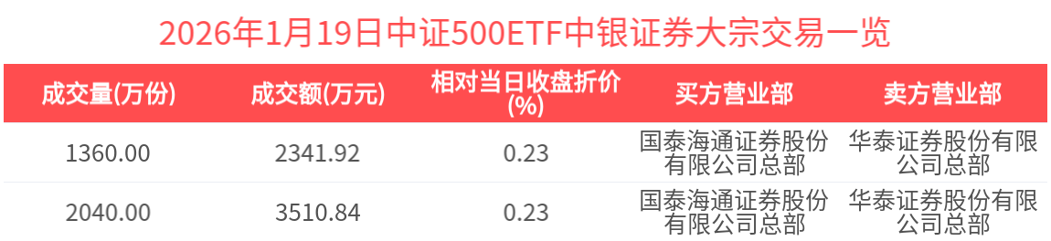 2026年1月19日,中证500ETF中银证券(515190.SH)获大宗交易折价卖出5852.76万元,居全市场第一。