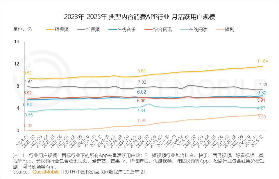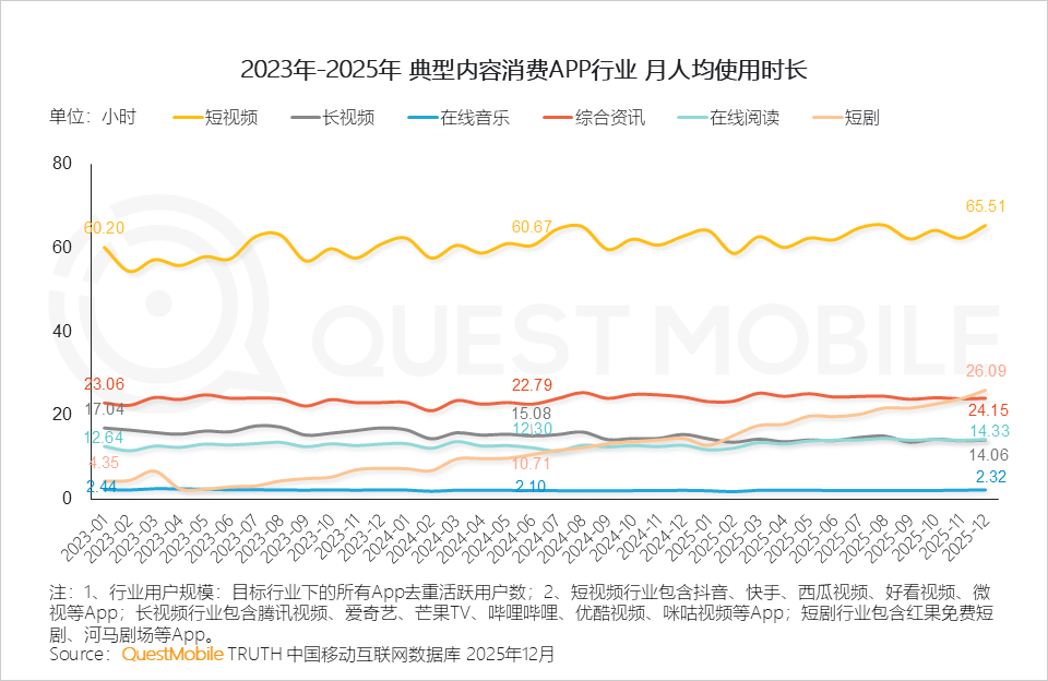 QuestMobile数据显示,随着短剧持续成长,内容消费加速迭代的态势迅猛,截止到2025年12月,短剧的月人均时长已经超过了综合资讯、长视频、在线阅读等赛道;同时,短视频平台和长视频平台纷纷抢滩短剧赛道,形成了新的合纵连横的格局。