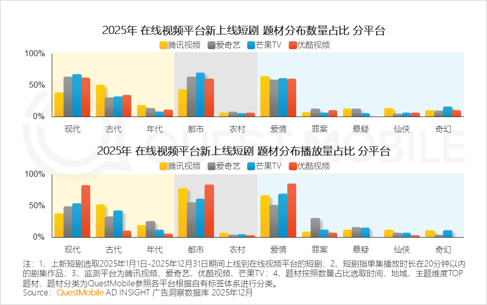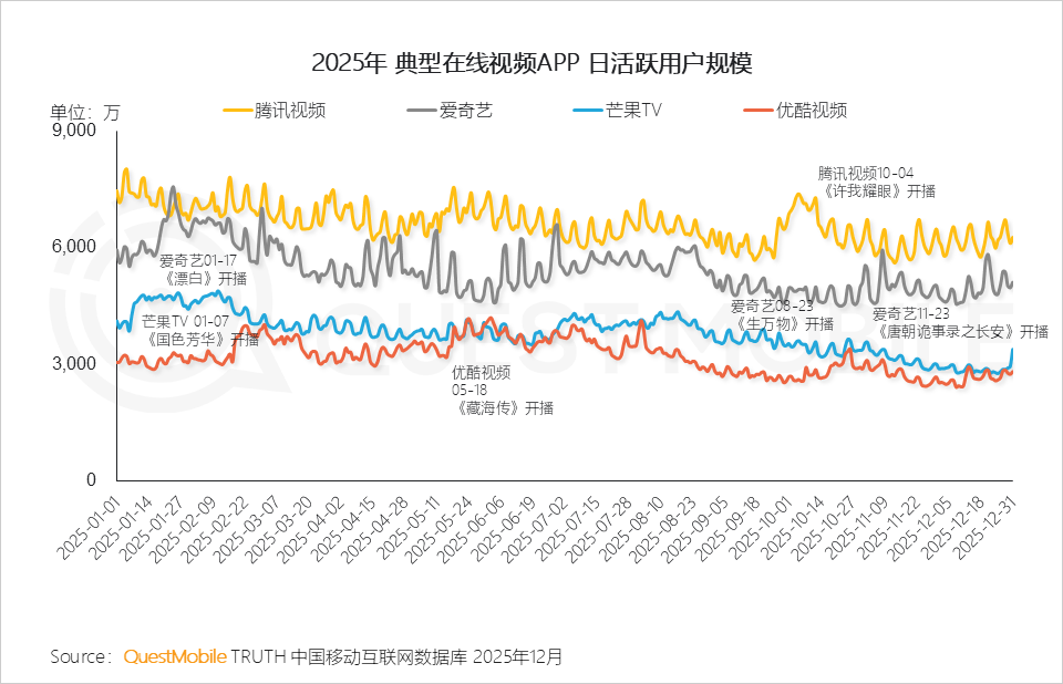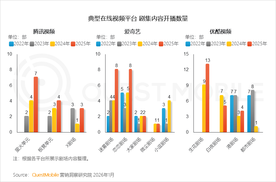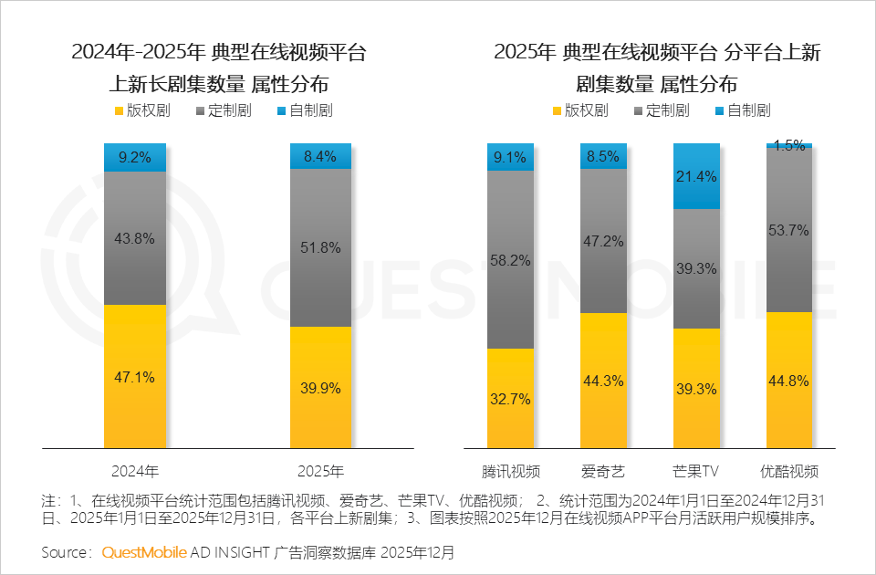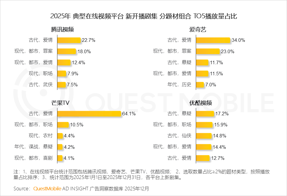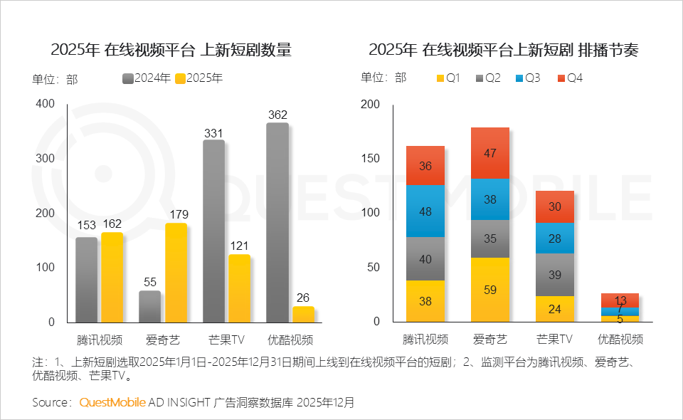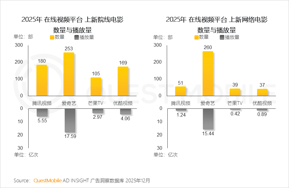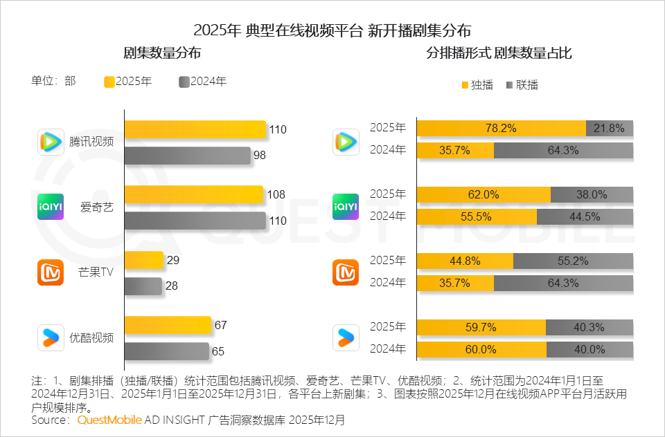 QuestMobile数据显示,2025年腾讯视频、爱奇艺、芒果TV、优酷视频四大视频平台,共上新268部剧集,同比2024年增长11.7%。