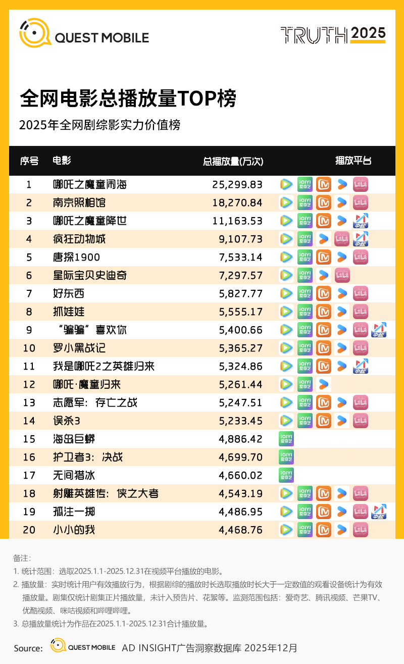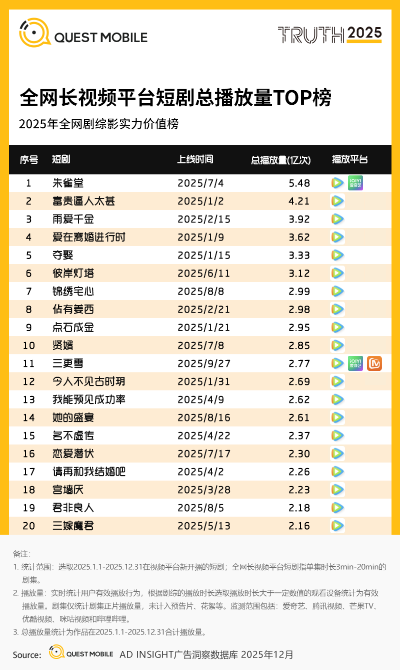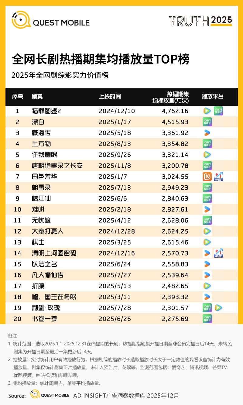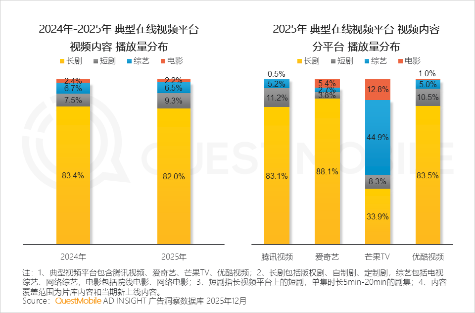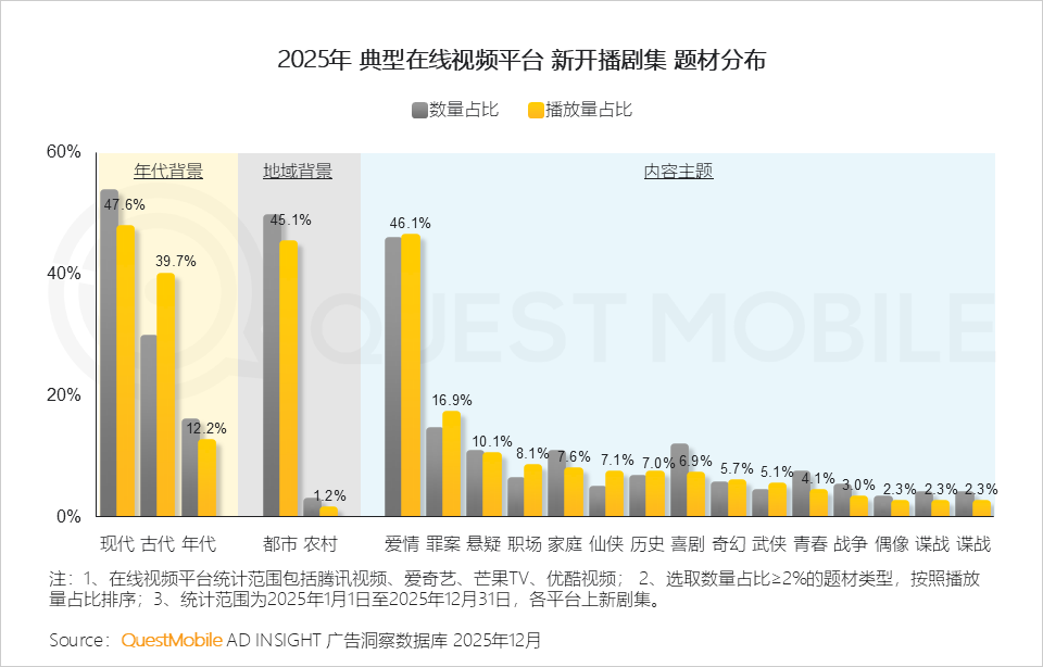 QuestMobile数据显示,2025年腾讯视频、爱奇艺、芒果TV、优酷视频四大视频平台,共上新268部剧集,同比2024年增长11.7%。