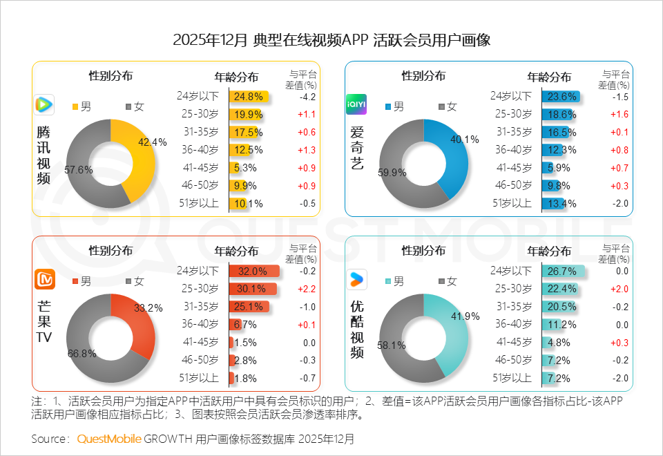 对于在线视频来说,会员经济与广告变现已经是当下增长的关键动力,2025年,在线视频会员服务收入占比已经达到59.1%,腾讯视频、爱奇艺、优酷视频、芒果TV会员用户构成相对类似,35岁以下用户占比分别为62.2%、58.7%、87.2%、69.6%,这部分人群对精品内容的偏好明显。