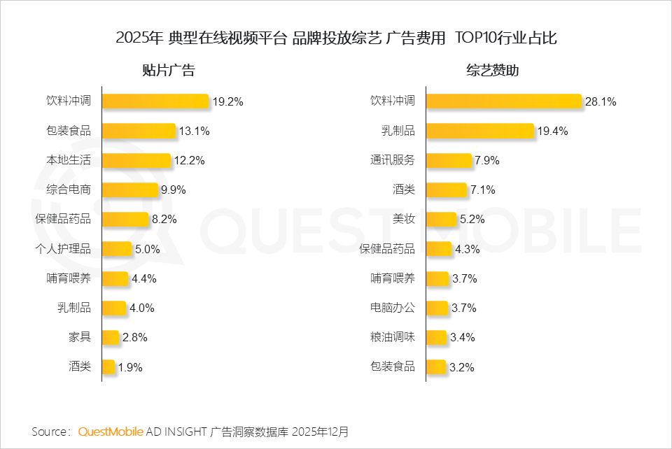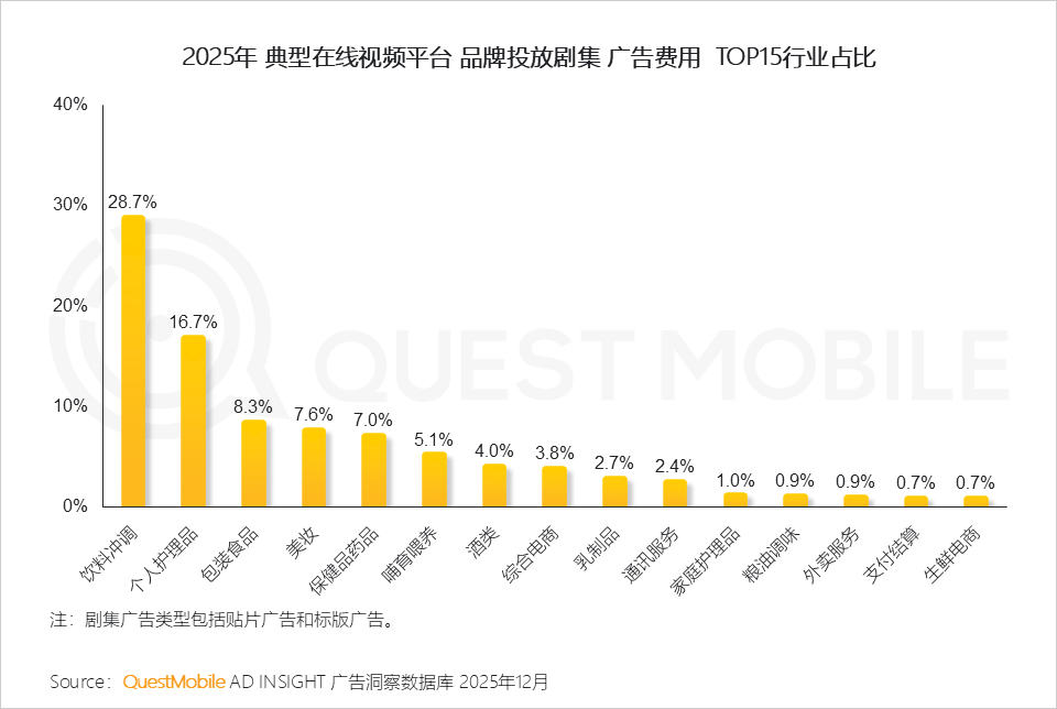 2.1从广告营收上看,饮料冲调、个人护理品、包装食品行业高频投放剧集广告,占据市场近一半投放量