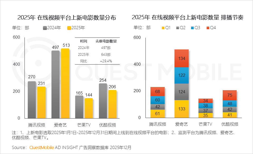 1.1 2025年在线视频平台电影供给数量上涨,各平台上新数量和排播节奏差异显著