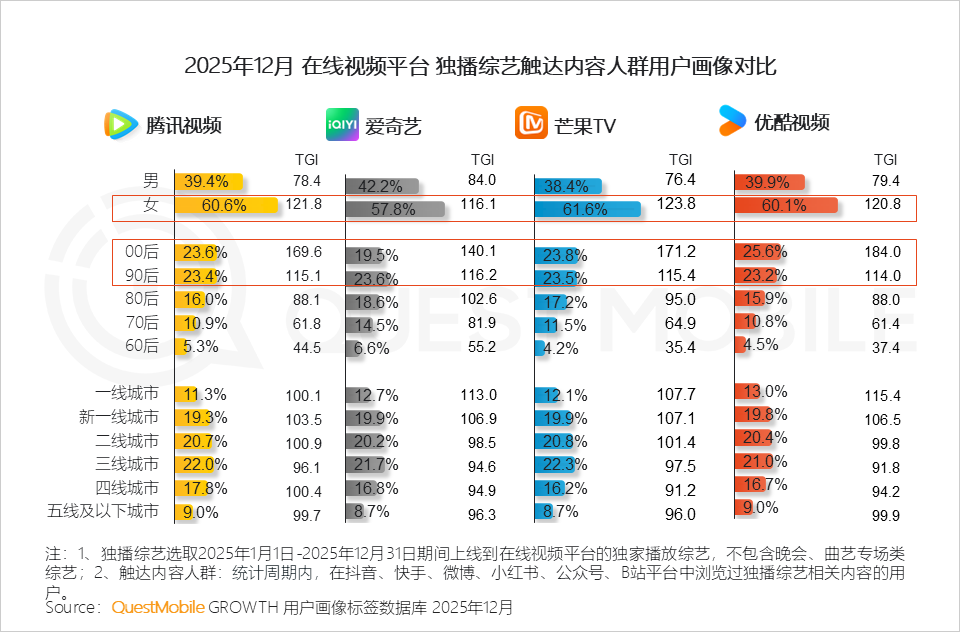 2.5 各个平台独播综艺皆触达广泛年轻女性用户,通过独播/自制综艺建立忠实用户群体