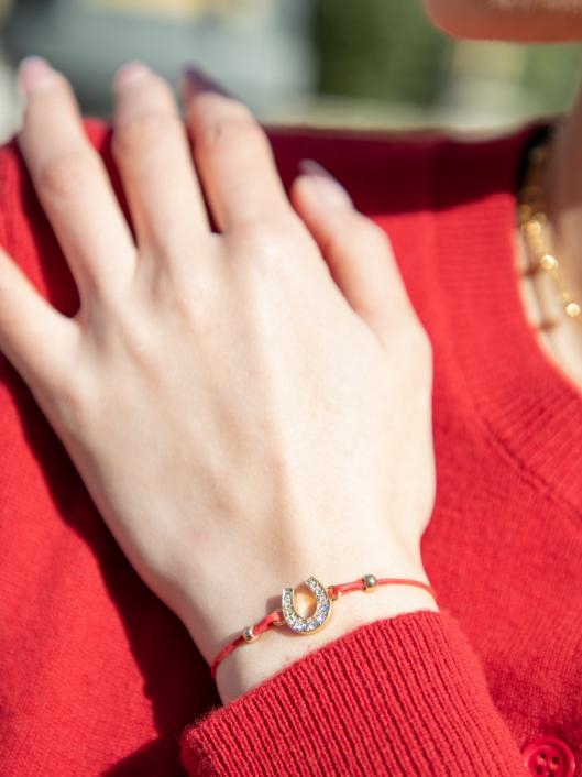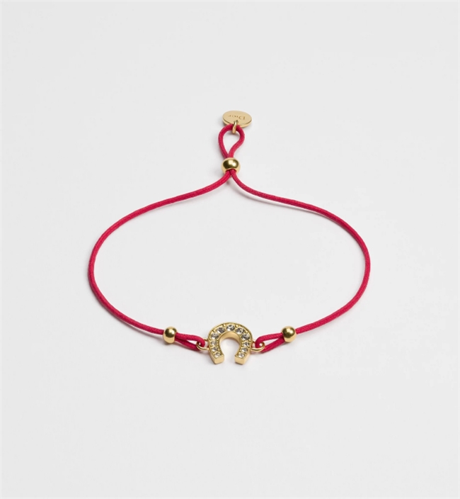 绳线上,一枚小巧的金色饰面金属马蹄铁悠然垂坠,同样密镶白色晶体。它的尺寸更为秀气,适合日常佩戴,也便于与其他手链或腕表叠搭,营造层次丰富的个人风格。