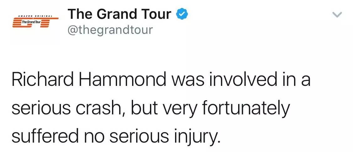 英国著名汽车媒体人理查德·哈蒙德,昨天在瑞士录制The Grand Tour第二季的节目时发生严重事故。