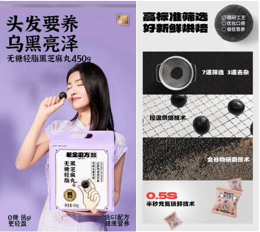 在黑芝麻丸这一品类中,传统“九蒸九晒”工艺常面临标准模糊与卫生难以管控的质疑。老金磨方的做法是,把老师傅凭手感的“经验”变成了工业化生产精准执行的“数据”,通过向消费者展示黑芝麻在现代化工厂中的标准化“蒸-晒”循环参数,包括恒温蒸煮的时长、低温烘焙湿度控制以及充氮锁鲜的氧残量等指标。这不仅保留了传统工艺的文化溢价,又用现代化标准消除了消费者对传统手工生产卫生状况不稳定的顾虑。