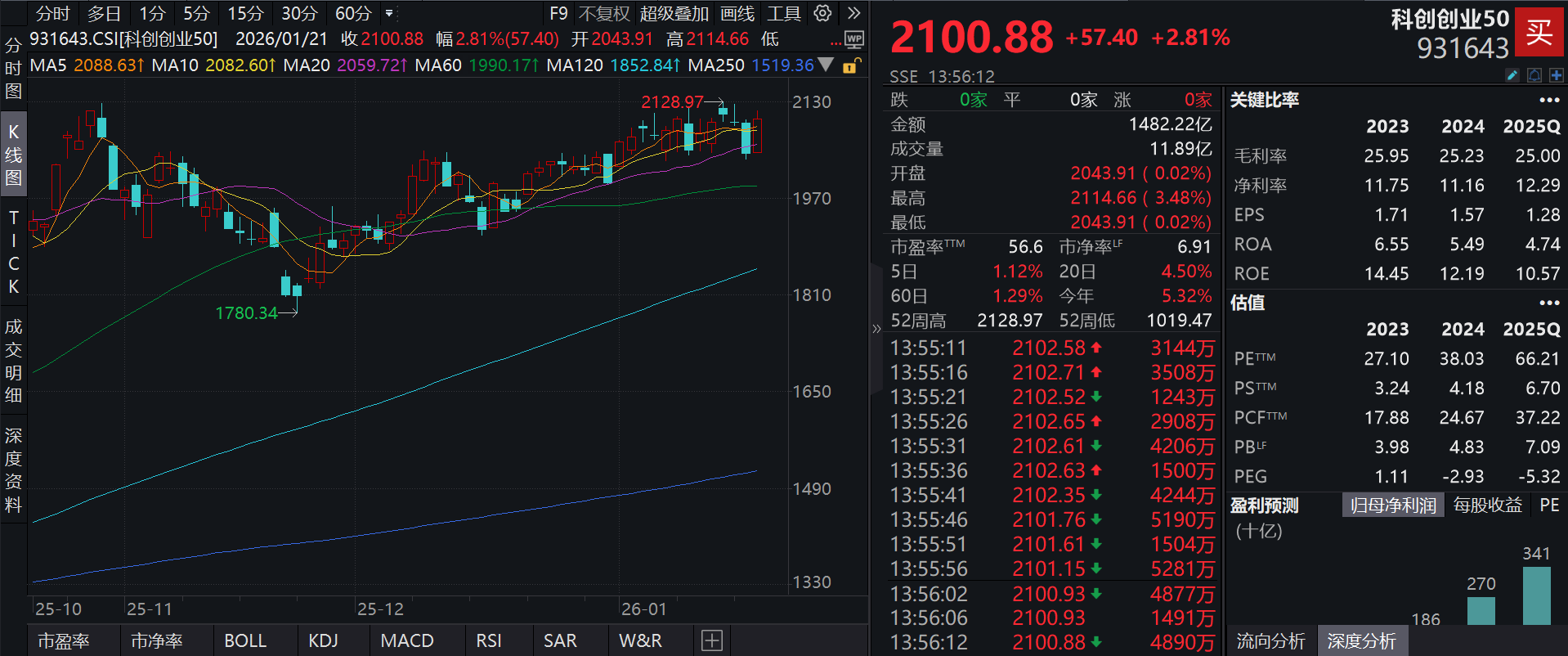 截至2026年1月21日 13:56,科创创业50指数(931643)强势上涨2.81%,成分股龙芯中科(688047)上涨20.00%,海光信息(688041)上涨13.30%,澜起科技(688008)上涨12.01%,三环集团(300408),圣邦股份(300661)等个股跟涨。