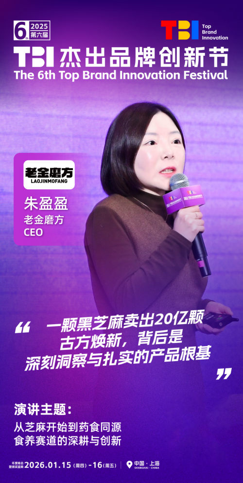 构建信任之外,老金磨方CEO朱盈盈从小小一粒芝麻讲起,为我们分享了年轻化焕新的底层逻辑。她介绍了老金磨方的品牌成长历程,并剖析了将之前被视为传统,甚至“有点土”的中式滋补养生食材,摇身一变打造成潮流单品的背后故事。