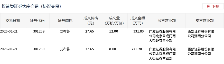 1月21日,艾布鲁大宗交易成交20万股,成交额553万元,占当日总成交额的4.77%,成交价27.65元,较市场收盘价34.6元折价20.09%。