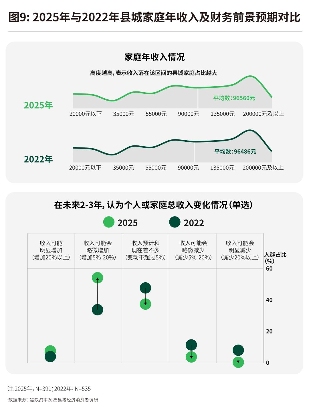 2025年,县城居民预期未来2-3年收入会增长的比例较2022年有较大提升,但对于增长幅度的预期相对保守。