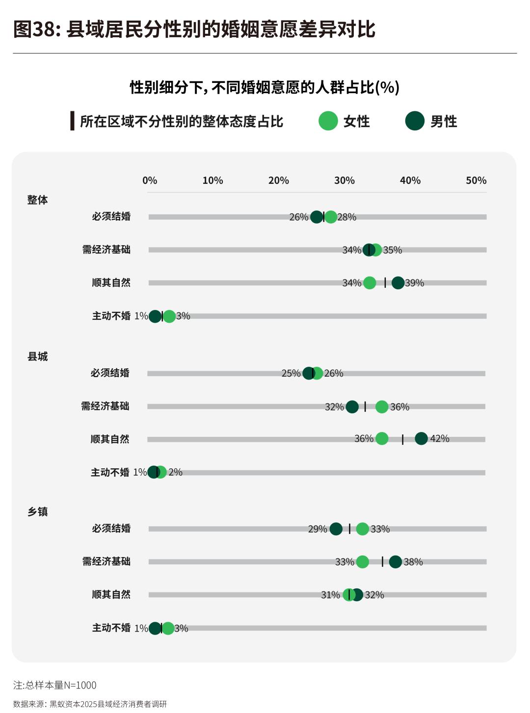 但当进一步细分县城与乡镇下不同性别对于婚姻的态度时,这产生了更细致的区别: