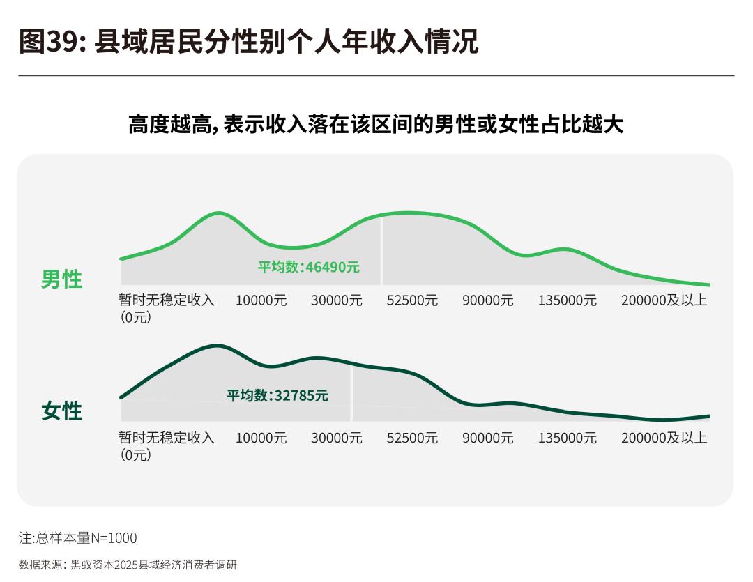 在定量调研中,我们看到男性的收入分布更向高收入区间倾斜,而64%的县域女性的个人年收入集中在3.5万元以下(即月薪不足3000元),这一比例显著高于男性(43%)。并且随着收入等级的提升,性别差距开始扩大。