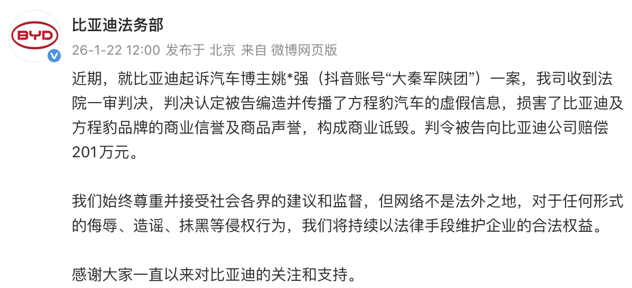 1月22日,比亚迪法务部发文表示,就比亚迪起诉汽车博主姚*强(抖音账号“大秦军陕团”)一案,公司近期收到法院一审判决,判决认定被告编造并传播了方程豹汽车的虚假信息,损害了比亚迪及方程豹品牌的商业信誉及商品声誉,构成商业诋毁。判令被告向比亚迪公司赔偿201万元。比亚迪方面表示,始终尊重并接受社会各界的建议和监督,但网络不是法外之地,对于任何形式的侮辱、造谣、抹黑等侵权行为,将持续以法律手段维护企业的合法权益。