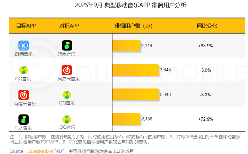 同据QuestMobile数据,截至2025年9月底,汽水音乐与酷狗音乐、QQ音乐徘徊用户数已分别达2149万、2158万,且同比分别大幅提升63.9%和72.9%,可见市场竞争加剧;而QQ音乐与网易云音乐互为最大的徘徊用户来源,同比小幅下降3%,用户在两平台间双向流动达到暂时动态平衡点。换句话说,腾讯系和网易系两大移动音乐阵营已进入战略相持阶段,但后起之秀汽水音乐不但月活一路猛增,而且它还在拓展空白地带的同时,继续大力淘洗和吸纳如上两个竞争对手的存量用户,国内移动音乐市场或将迎来深层次重构。