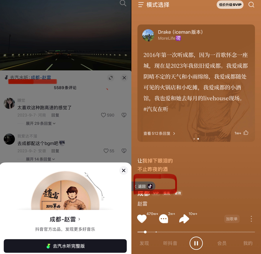这一支撑作用的实际效果在短剧业务上体现得颇为显著。以红果短剧爆款《盛夏芬德拉》为例,该剧全网播放量超44亿次,其成功很大程度上得益于背景音乐的精准选用。据海克财经观察,《盛夏芬德拉》共选用了28首BGM,其中陈绮贞的《鱼》、伍佰的《泪桥》等因贴合剧情,在抖音等平台引发了二创热潮,用户可通过短视频左下角入口,直接跳转至汽水音乐APP收听完整版,这进一步验证了内容带火音乐、音乐反哺内容的正循环。