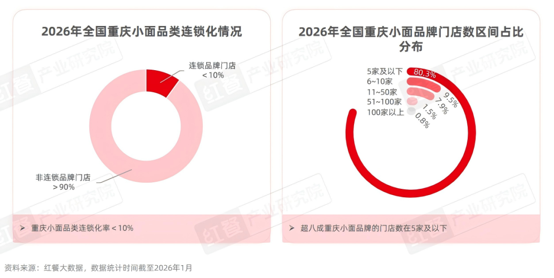与面馆大赛道相似,重庆小面赛道当前仍以夫妻店、街边摊为主,连锁化水平和品牌规模化程度整体偏低。红餐大数据显示,截至2026年1月,重庆小面品类连锁化率不足10%。其中,80.3%的品牌门店数在5家及以下,而门店数在100家以上的品牌数占比仅为0.8%。