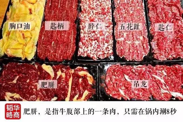 比如肥胼,是指牛腹部上的一条肉,只需在锅内涮8秒左右的时间,就能让油香与肉香弥漫整个口腔;切成片状后的匙柄,中间会有一条明显的肉筋,入锅8—12秒味道最佳;