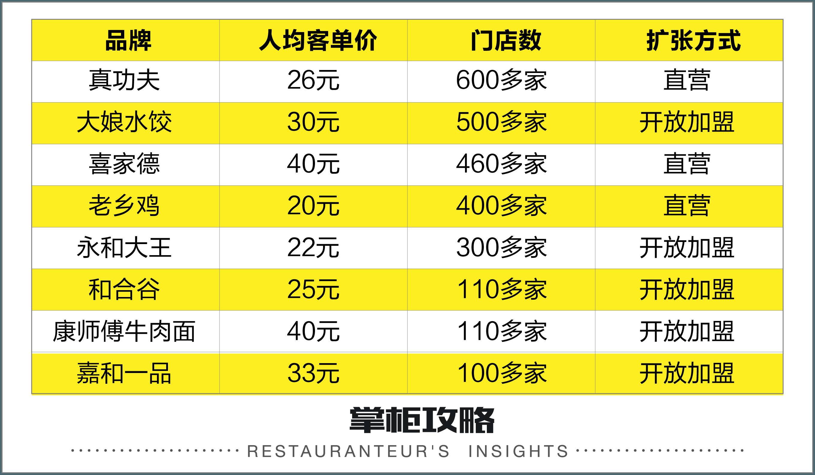 把目光拉回中式快餐上,国内的中式快餐连锁规模还停留在百位数。主打的品类以米饭和面食为主,客单均价从 20 - 40 元不等。从扩张方式看,既有直营也有加盟。