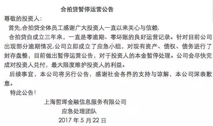运盛医疗(600767.SH)在4月30日发布的2016年度财务报表,已经暗示了合拍贷的净资产为-4003万元以上了,资不抵债了,如果投资人能稍微留意一下,发现风险,提早提现离场,也不会落到老板跑路,1.5亿元待偿投资款难以兑付的下场。