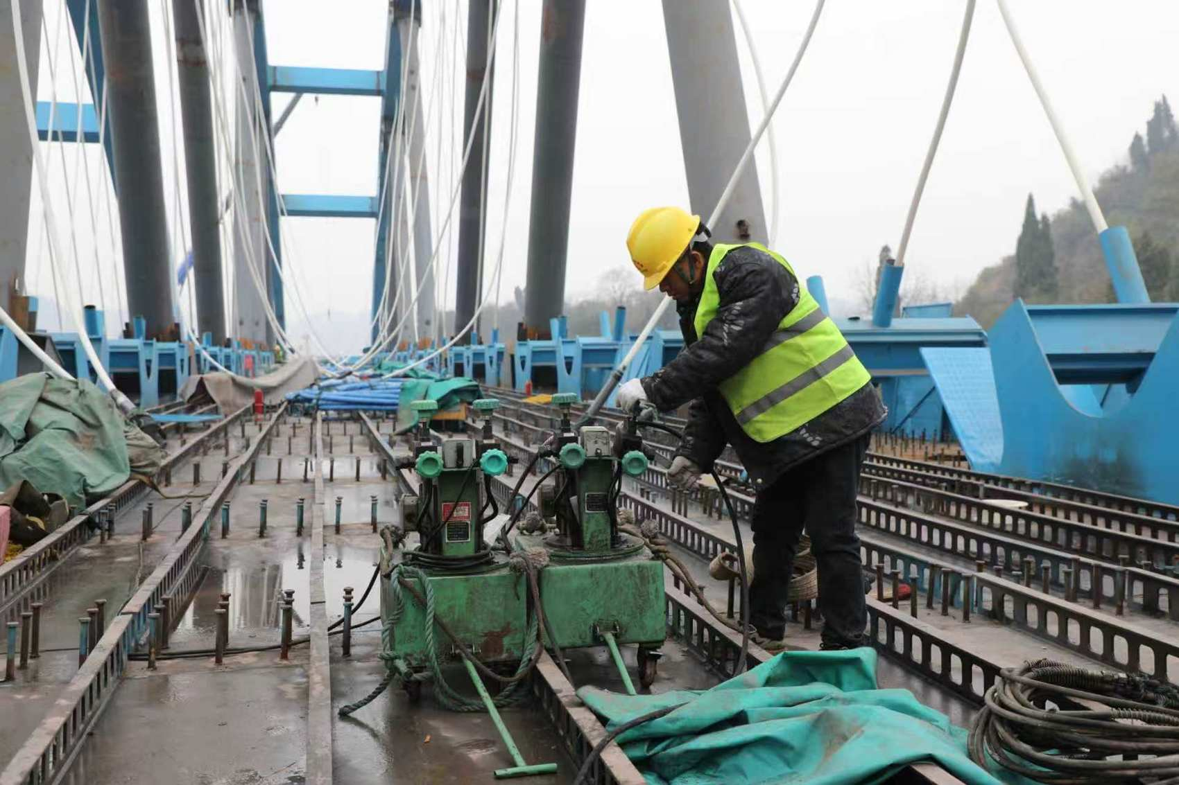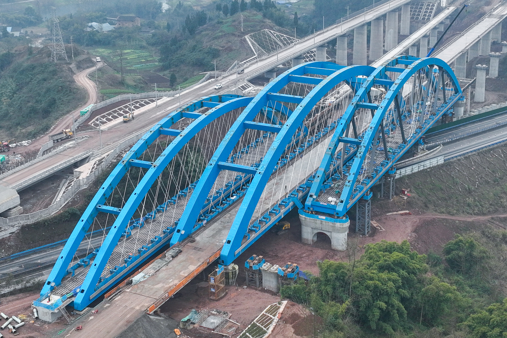走进西渝高铁跨营达高速公路大桥的建设现场,可以发现三座并排的蓝色拱桥。