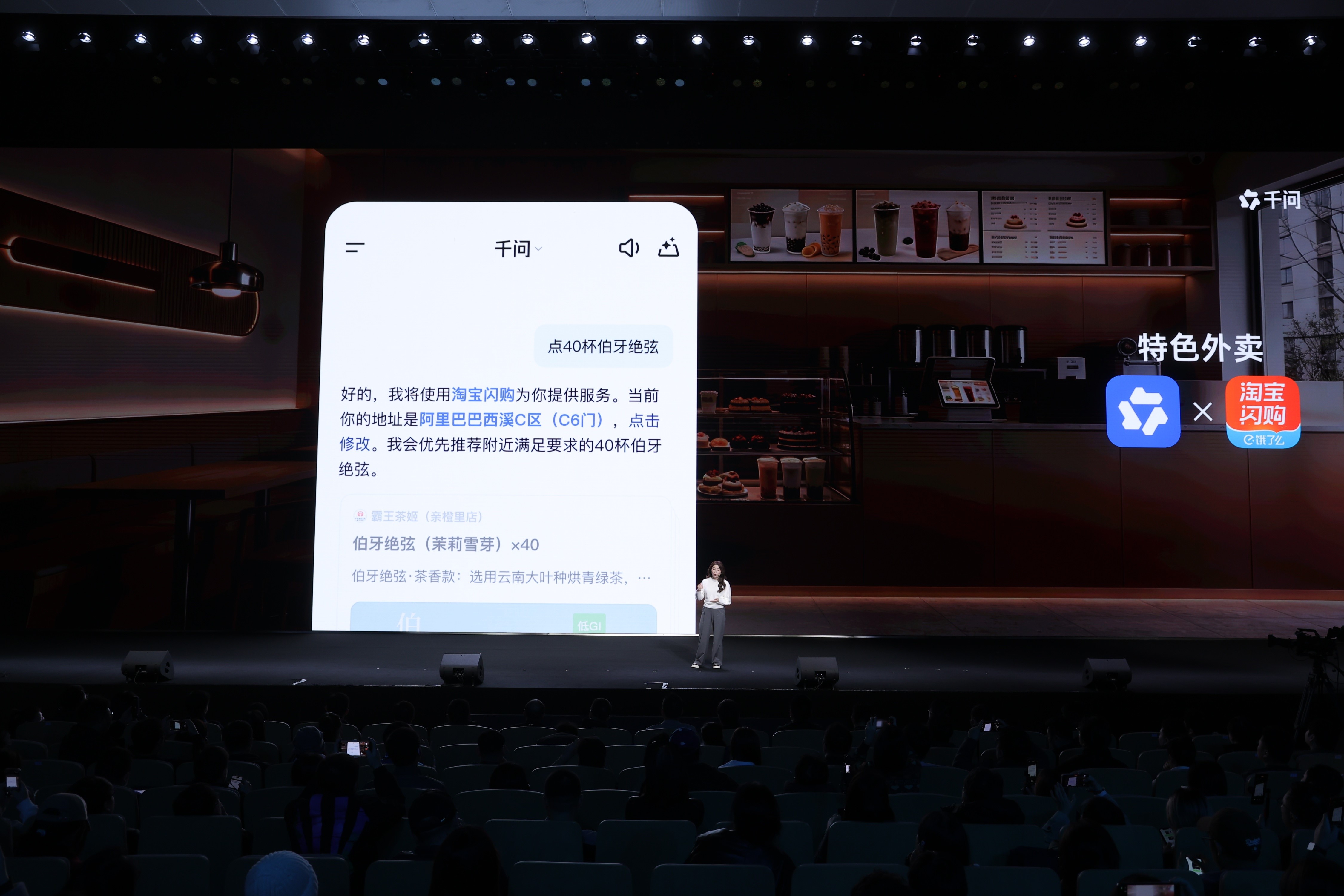 当天发布会上,“一句话点外卖”是最受外界关注的功能。用户可通过自然语音指令,即可完成原本需数十步操作的外卖下单流程。阿里巴巴集团副总裁、千问C端事业群总裁吴嘉向千问说了一句话,随后40杯霸王茶姬的奶茶便送到现场。