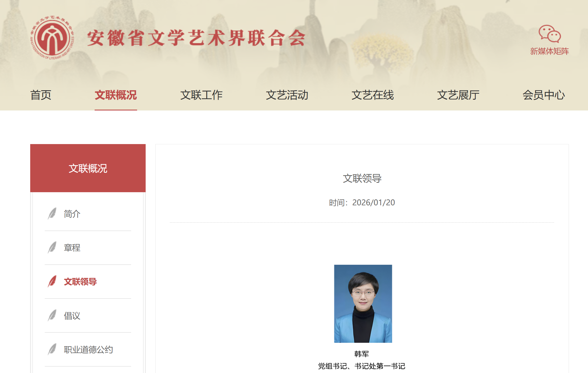 据安徽省文学艺术界联合会官网更新显示:韩军已任安徽省文学艺术界联合会党组书记、书记处第一书记。