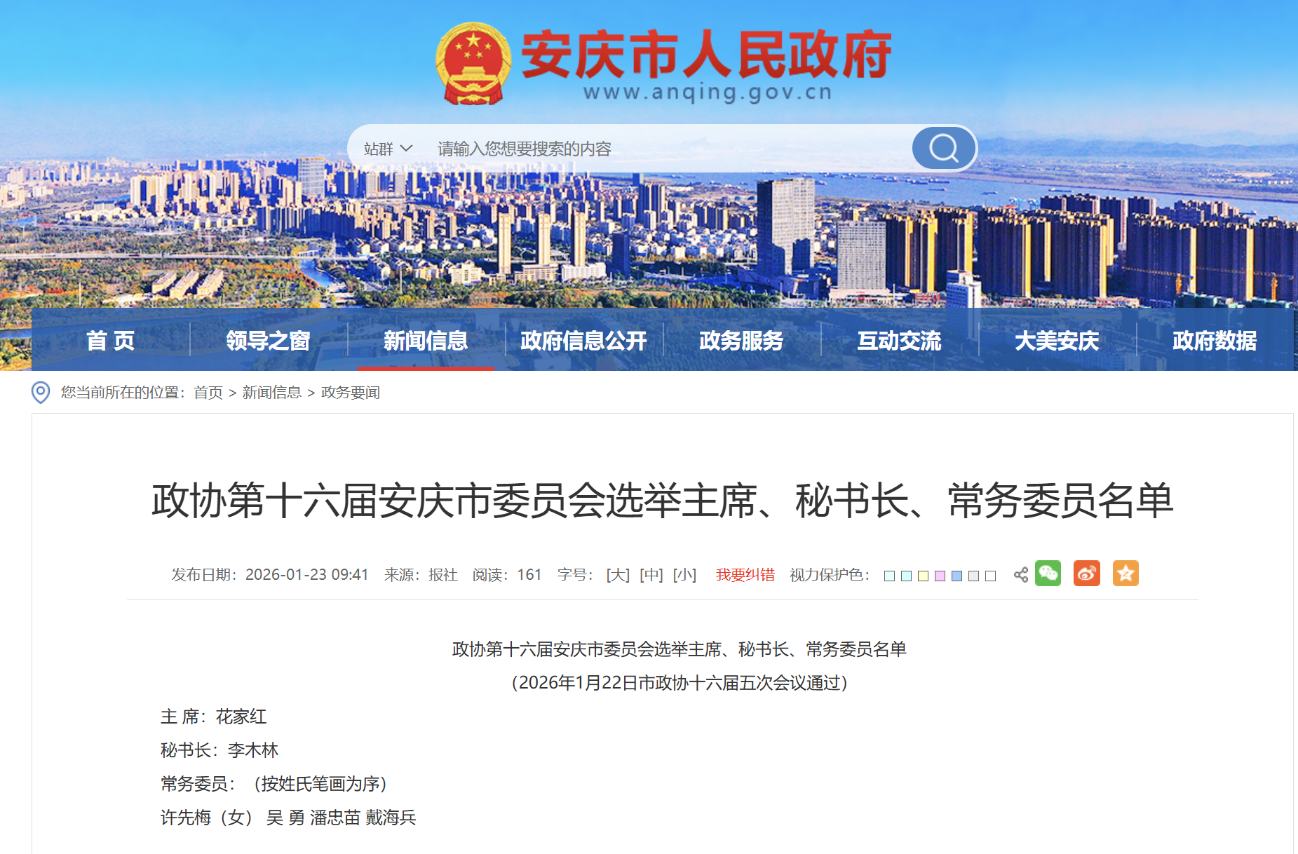 据安庆市人民政府官网消息,1月22日下午,中国人民政治协商会议第十六届安庆市委员会第五次会议,选举花家红为政协第十六届安庆市委员会主席。