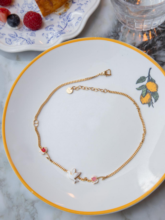 项链主体为金色饰面金属链条,质感高级且易于搭配。其最动人的细节在于坠饰:多色涂漆的鸽子和玫瑰栩栩如生,鸽子象征和平与忠贞,玫瑰则是爱与美的永恒化身。