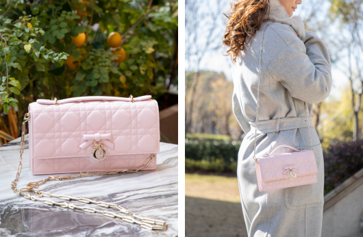 建议将两件单品置于一个大型的迪奥包装盒中,或定制一个专属礼盒。先将淡柔粉色手袋放置其中,然后将项链装入其绒布收纳袋,悄悄放入手袋的内部隔层。