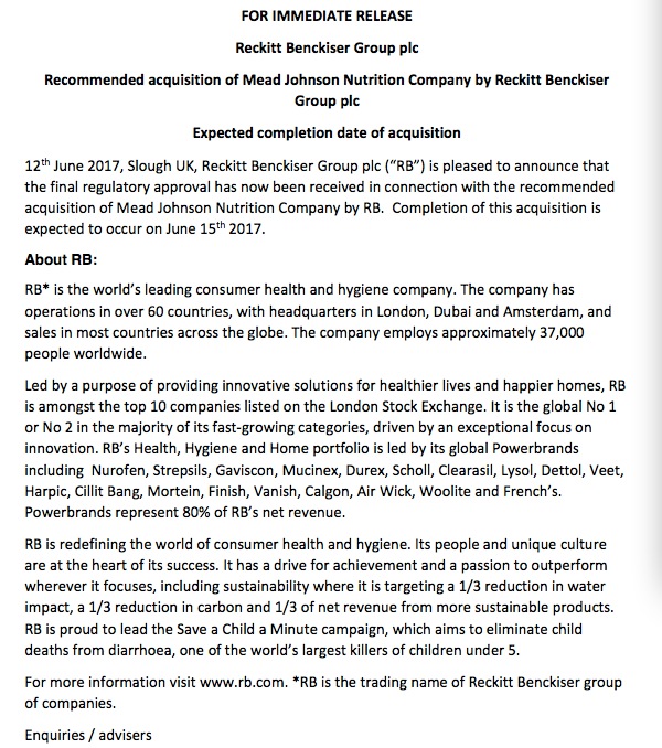 英国快消巨头、滴露和杜蕾斯的母公司利洁时(Reckitt Benckiser Group plc,简称“RB”)6月12日在官网正式宣布,其收购美赞臣(Mead Johnson)事宜已获得监管部门的最终批准,该项收购将于6月15日完成。这意味着卖安全套的杜蕾斯和卖奶粉的美赞臣正式成为一家子。