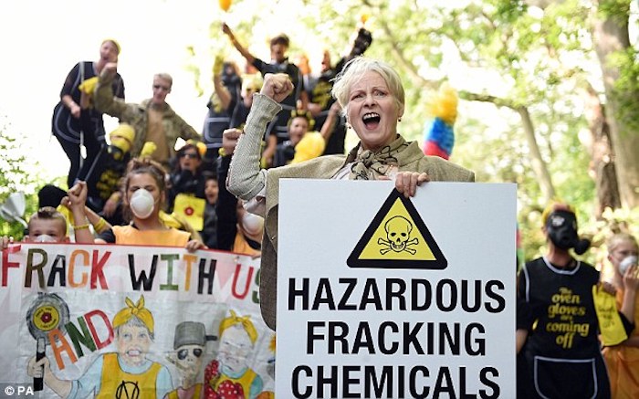 上一季的伦敦男装周,这位老太太头戴纸皇冠,办了场将民主选举、节能减排等政治、社会话题直接融入设计的男女装联合发布会。在这之前,她还有过组织60位明星拍照,以号召网友联名抵制壳牌石油公司“液压破碎法”开发页岩气,以及驾着坦克去时任英国首相卡梅伦私人住宅外示威的壮举。而在这些大动静外,她还三不五时在社交网络又或是媒体活动上公开发表些激进言论。