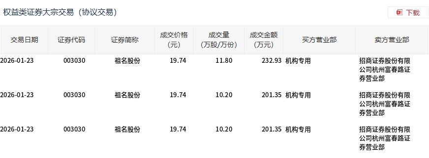 1月23日,祖名股份大宗交易成交32.2万股,成交额635.63万元,占当日总成交额的13.66%,成交价19.74元,较市场收盘价21.69元折价8.99%。