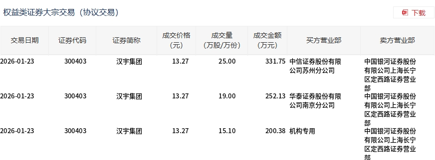 1月23日,汉宇集团大宗交易成交59.1万股,成交额784.26万元,占当日总成交额的2.02%,成交价13.27元,较市场收盘价15.02元折价11.65%。