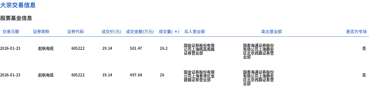 1月23日,起帆电缆大宗交易成交52.2万股,成交额999.11万元,占当日总成交额的2.21%,成交价19.14元,较市场收盘价22.82元折价16.13%。