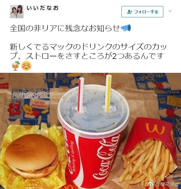 上周,日本麦当劳限量推出了双孔巨型可乐。情侣可以“双管齐下”,共饮一杯。▼
