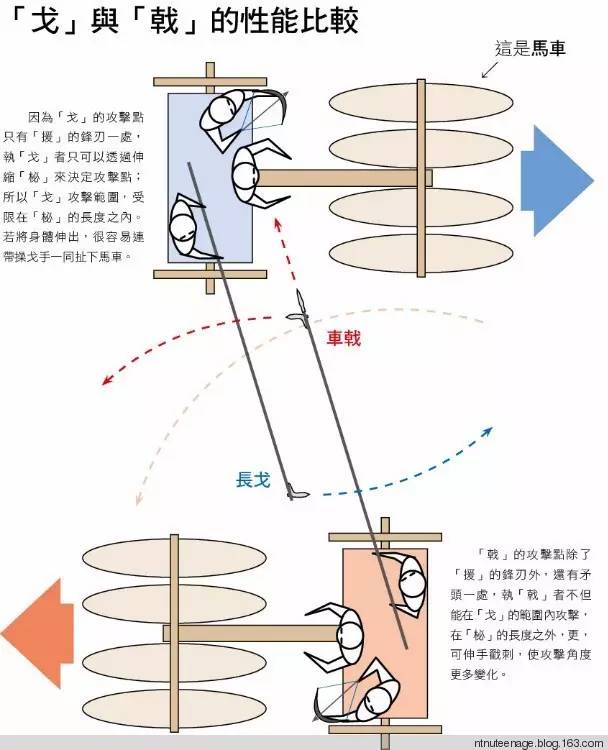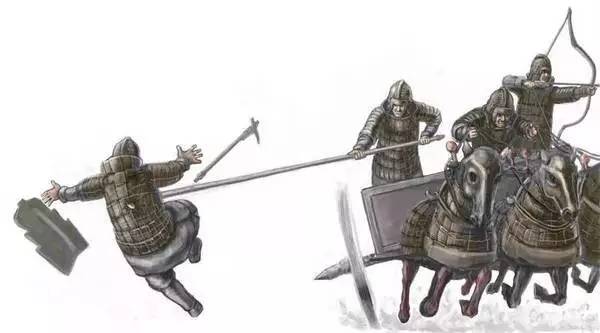 而战车不像骑马可以两人正面互怼,所以只能对方战车错身而过,这时候车右就会用戈或勾或击对方战车上的人员,直接将他勾下马,攻击地面步兵同样有效。当战车快速相错时,戈的攻击力非常大,一旦勾到基本必死。