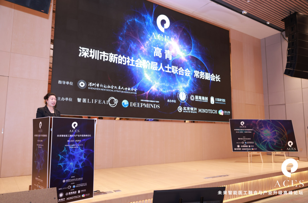 ACES高峰论坛指导单位深圳市新的社会阶层人士联合会常务副会长高青,主办方代表智医LIFEAI副总裁李文丽,以及承办单位代表前海海创创始人何婧先后致辞,承办单位北京银行进行主题分享。对医工交叉创新在推动未来智能医疗产业升级、提升医疗健康服务、推动医疗科技产品研发落地能力中的重要作用给予充分肯定。